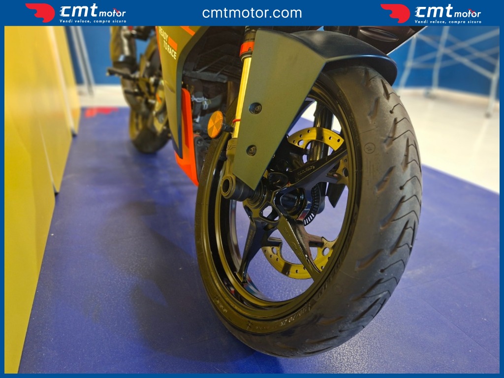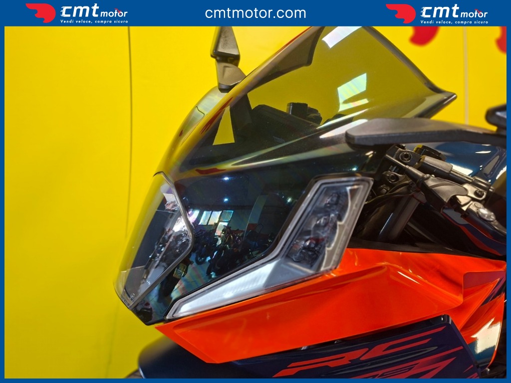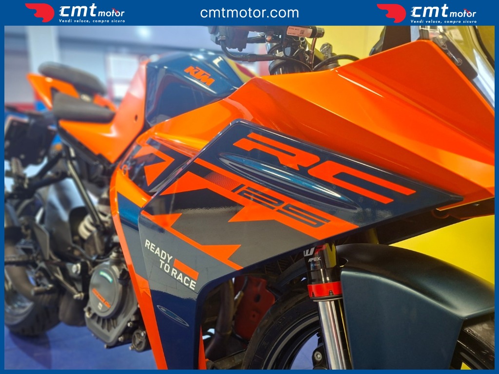 La KTM RC 125 è una sportiva 125 cc Euro 5 con motore monocilindrico 4 tempi da 15 CV e 12 Nm, ideale per patente A1. Monta telaio a traliccio in acciaio, sospensioni WP APEX e freni a disco con ABS Bosch a due canali. Il design è aggressivo e ispirato alle competizioni, con carenatura aerodinamica e posizione di guida sportiva. Strumentazione TFT a colori, luci full LED e peso di 147 kg